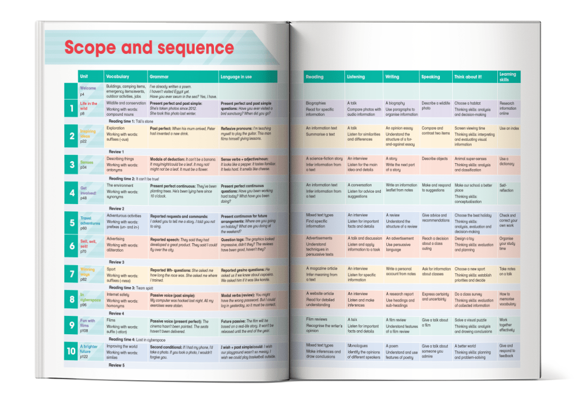 - Welcome: Làm quen và ôn tập kiến thức nền tảng; chủ đề về tòa nhà, vật dụng cắm trại, hoạt động ngoài trời, nghề nghiệp; luyện cấu trúc Present perfect và Past simple.
