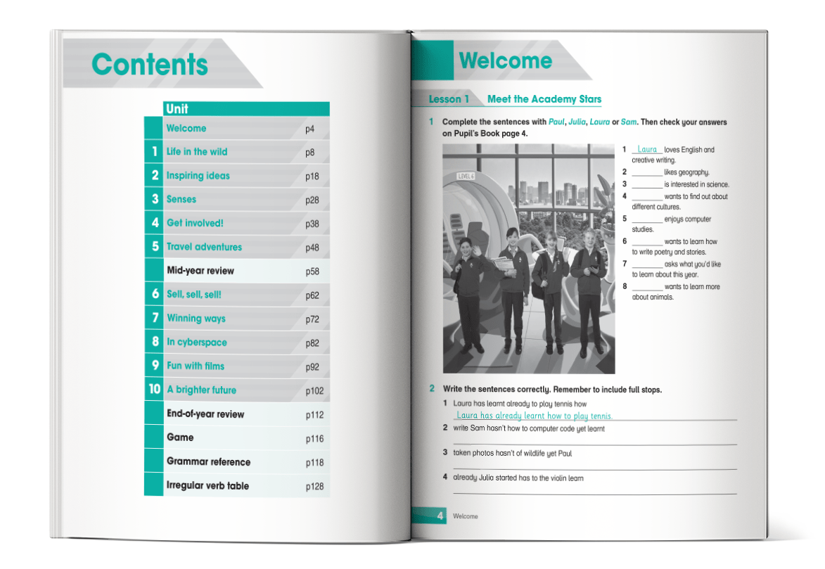 Academy Stars Workbook 6 gồm 10 Unit chính, kèm Review, Game, Grammar reference và Irregular verb table. Các mục chính như sau: