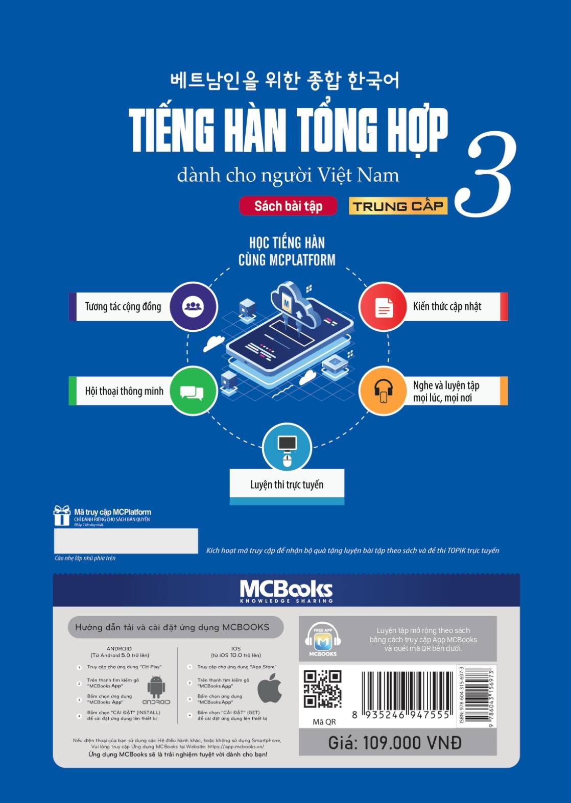 Tiếng Hàn tổng hợp dành cho người Việt Nam trung cấp 3 là bộ giáo trình dành cho người học ở trình độ tiếng Hàn trung cấp sau khi đã học hết cuốn 1 và 2. Bộ Tiếng Hàn tổng hợp trung cấp 3 gồm 2 cuốn là 1 sách giáo trình và 1 sách bài tập được thiết kế khoa học với đầy đủ 4 kỹ năng nghe – nói – đọc – viết.