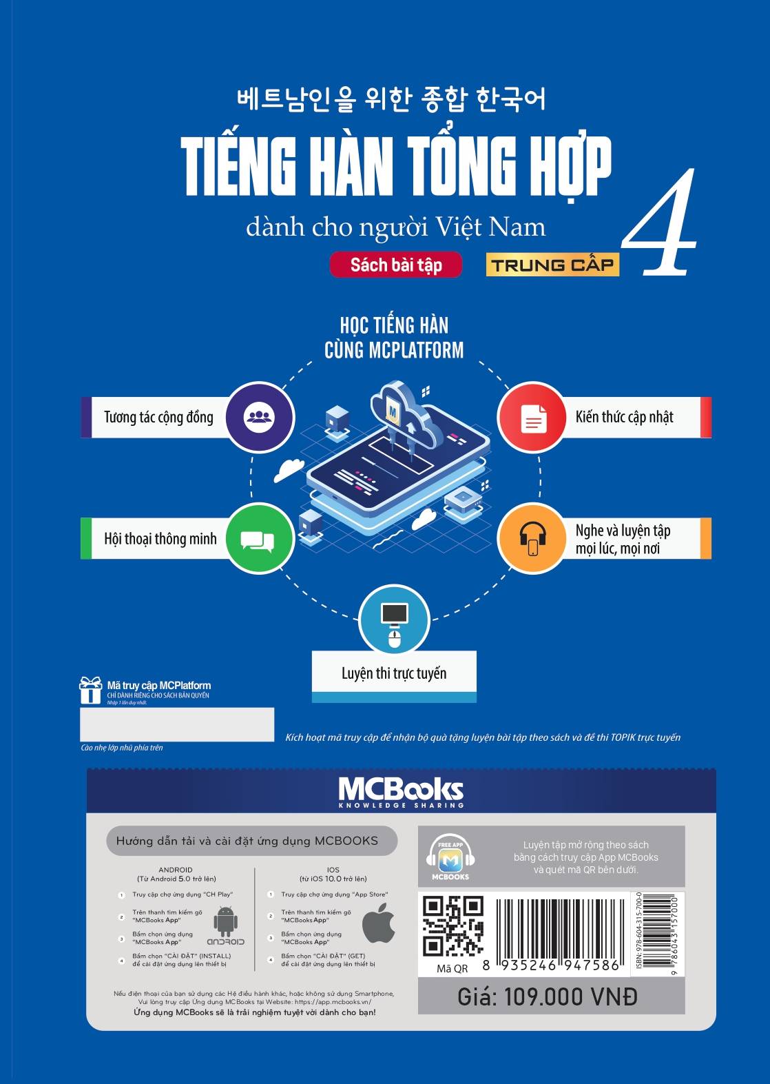 Tiếng Hàn tổng hợp dành cho người Việt Nam trung cấp 4 là bộ giáo trình dành cho người học ở trình độ tiếng Hàn trung cấp sau khi đã học hết sơ cấp 1, 2 và trung cấp 3. Bộ Tiếng Hàn tổng hợp trung cấp 4 gồm 2 cuốn là 1 sách giáo trình và 1 sách bài tập được thiết kế khoa học với đầy đủ 4 kỹ năng nghe – nói – đọc – viết.