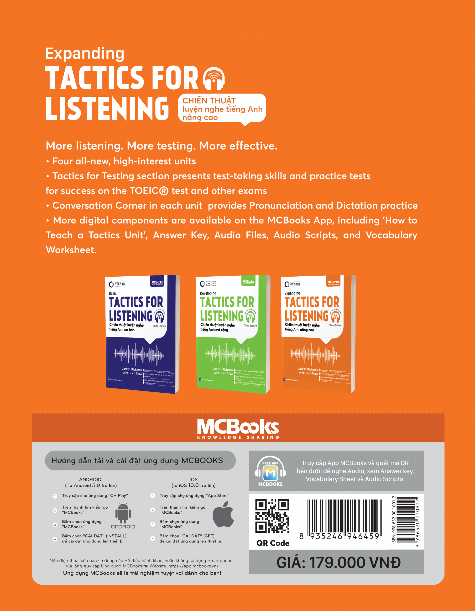 Tactics for Listening – Expanding là cuốn sách nằm trong bộ giáo trình nổi tiếng Tactics for Listening của do Oxford University Press phát hành và MCBooks giữ bản quyền tại Việt Nam. Cuốn sách được thiết kế dành cho người học ở trình độ trung – cao cấp, giúp phát triển kỹ năng nghe tiếng Anh học thuật và thực tiễn thông qua các tình huống giao tiếp sống động.