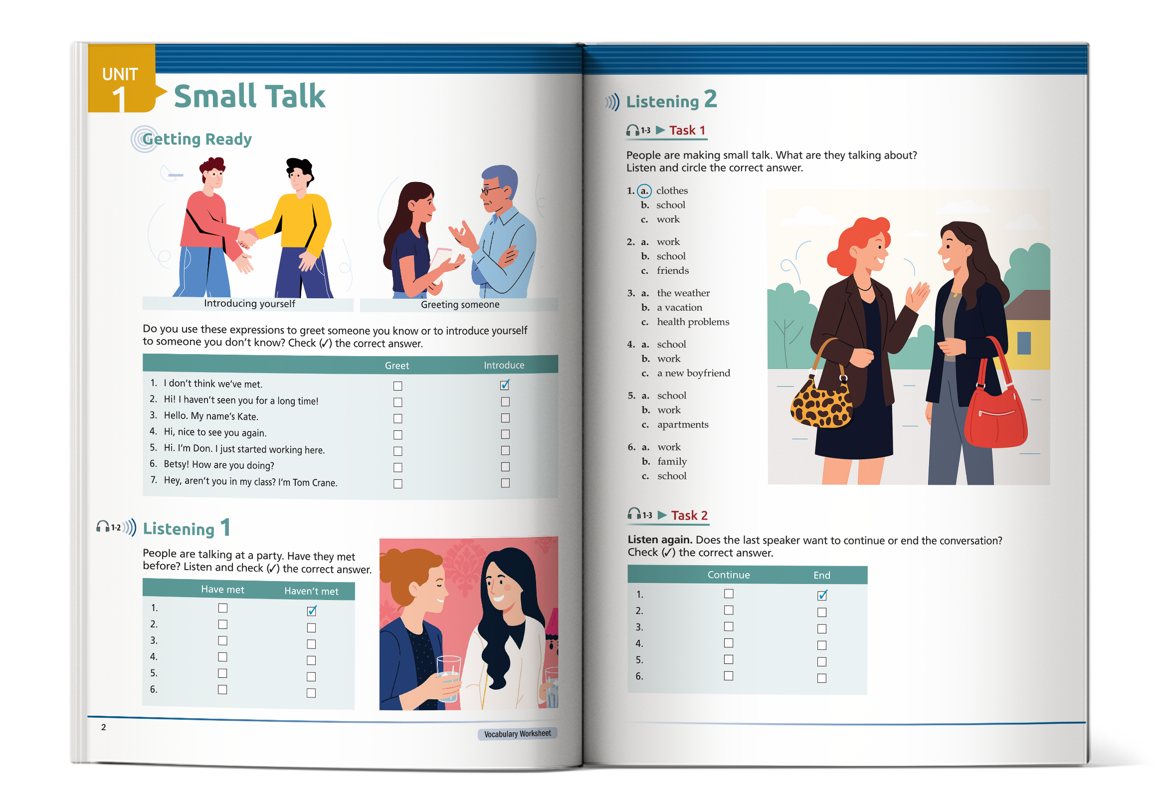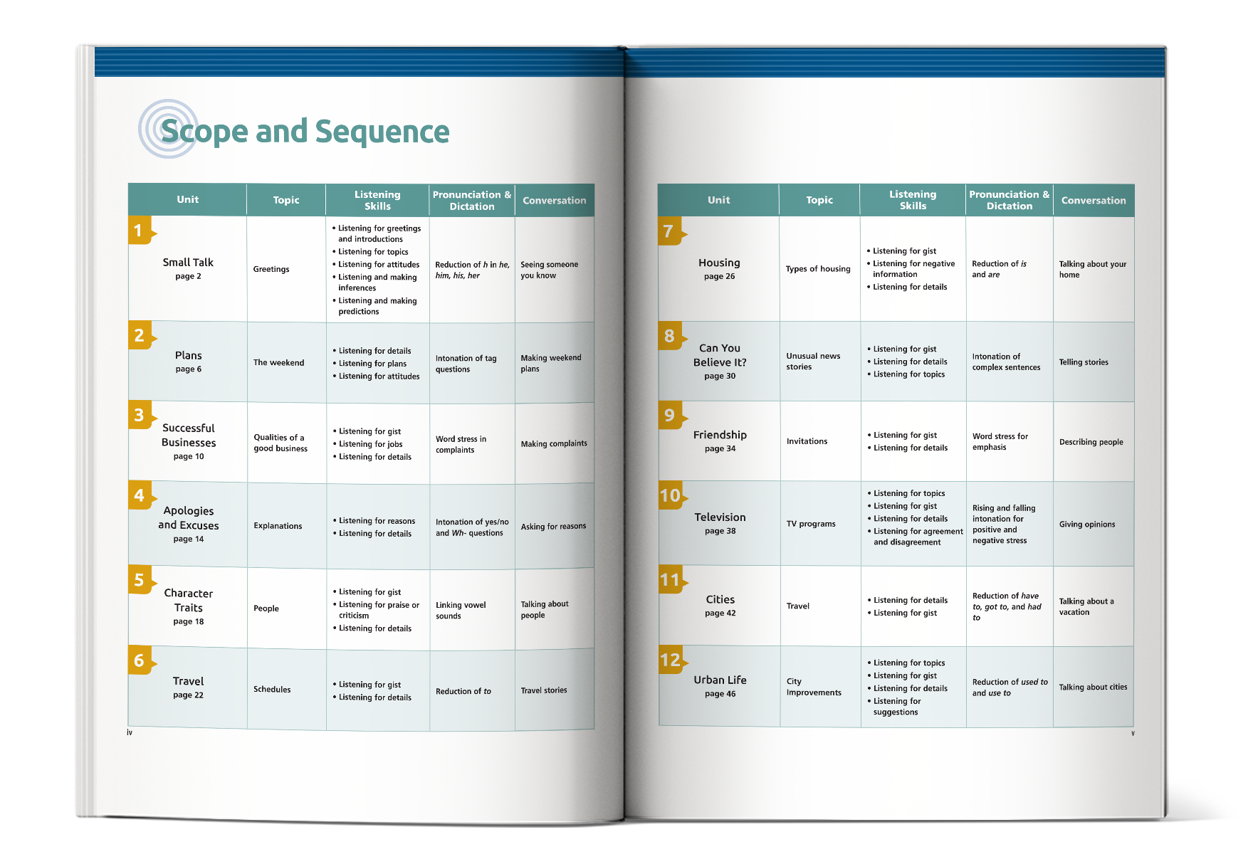 - Unit 1–6: Các chủ đề mở đầu xoay quanh giao tiếp hàng ngày như Small Talk, Plans, Apologies, Character Traits, Travel… giúp người học luyện khả năng nghe trong các tình huống thân quen và thực tế.